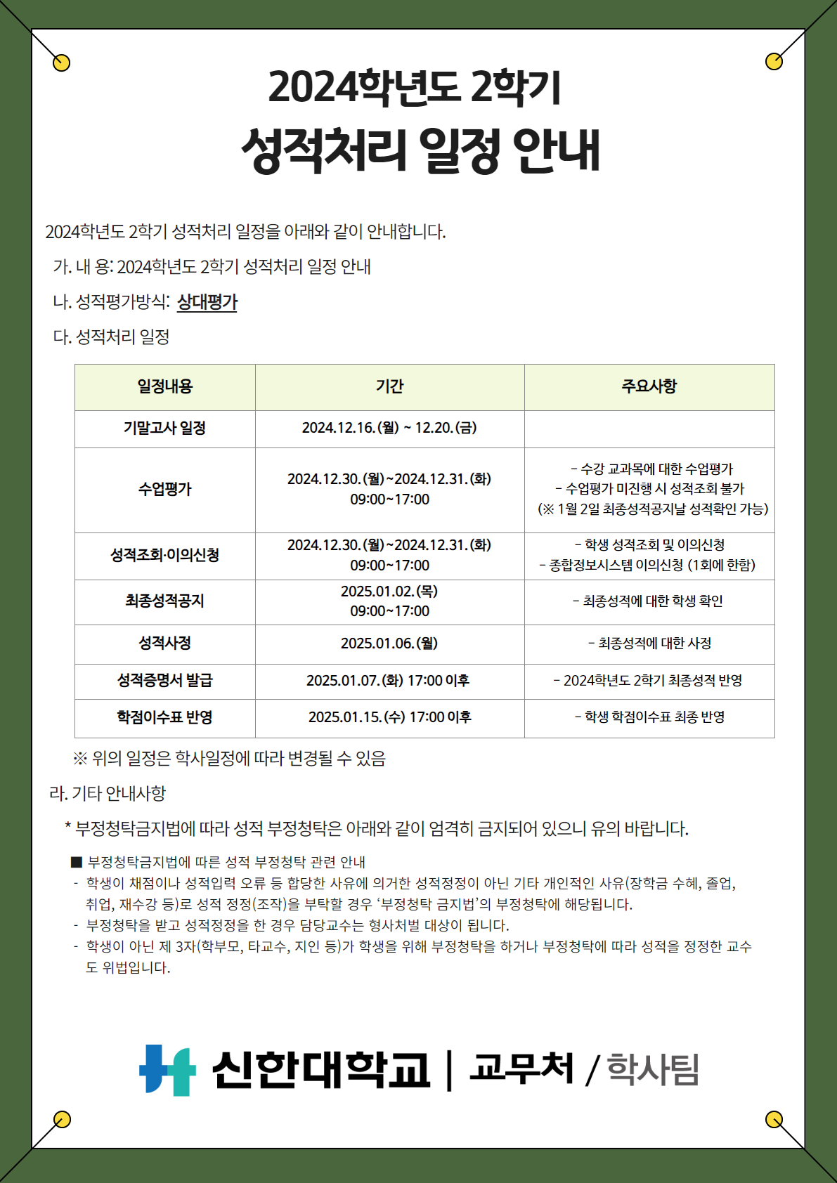 [성적] 2024학년도 2학기 성적처리일정 안내