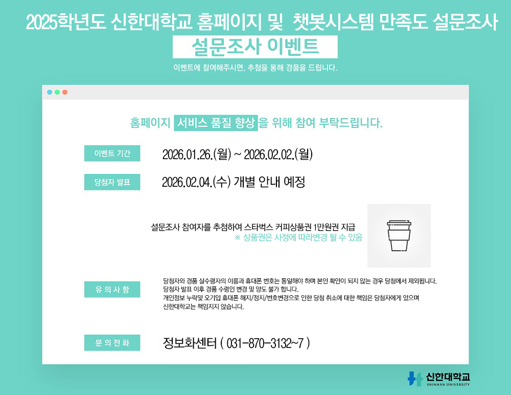 신한대학교 정보화센터에서는 2025학년도 홈페이지 및 챗봇시스템 만족도 조사를 실시하니 많은 참여부탁드립니다.